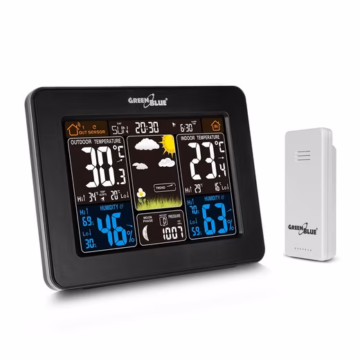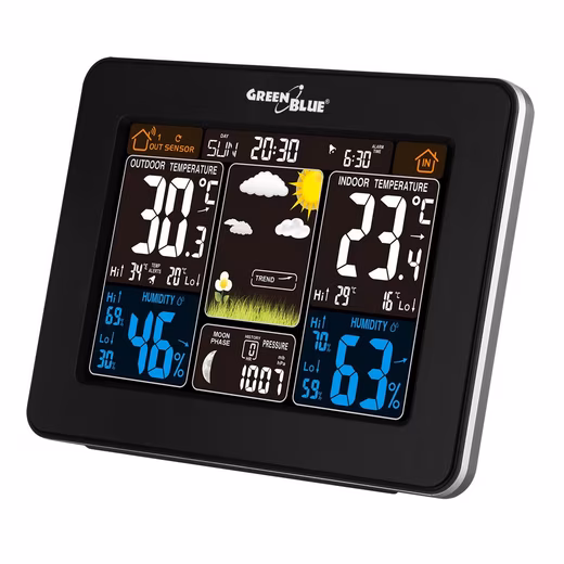 With the GreenBlue GB523 wireless weather station, you always have the weather in view! Sensors provide the weather station with information about the indoor and outdoor temperatures.