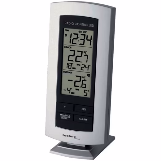 DCF-77 radio-controlled clock with manual setting option, time zone setting (± 12 h) , indoor and outdoor temperature display, MIN/MAX storage , alarm with snooze function, low battery indicator, wall mounting or table placement.