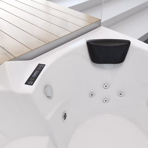 High stability is achieved by a substructure made of glass fibre reinforced fabric (GRP) and often also by reinforcing elements such as wood or aluminium. Our tubs have a particularly thick acrylic layer of 3 mm. As a result, you retain heat better and don’t feel as cold as regular tubs. Compared to enamel, they are a little more sensitive to scratches. However, the big advantage is that they can be removed wonderfully with repair kits. The particularly dense structure of the sanitary acrylic is practically non-porous, which is why limescale, soap residues or even bacteria have no chance of settling. Of course, everyone appreciates a hygienic and easy-to-clean hot tub. And last but not least, we would also like to mention the non-slip surface, which is resistant to impacts, breaks, and impacts.