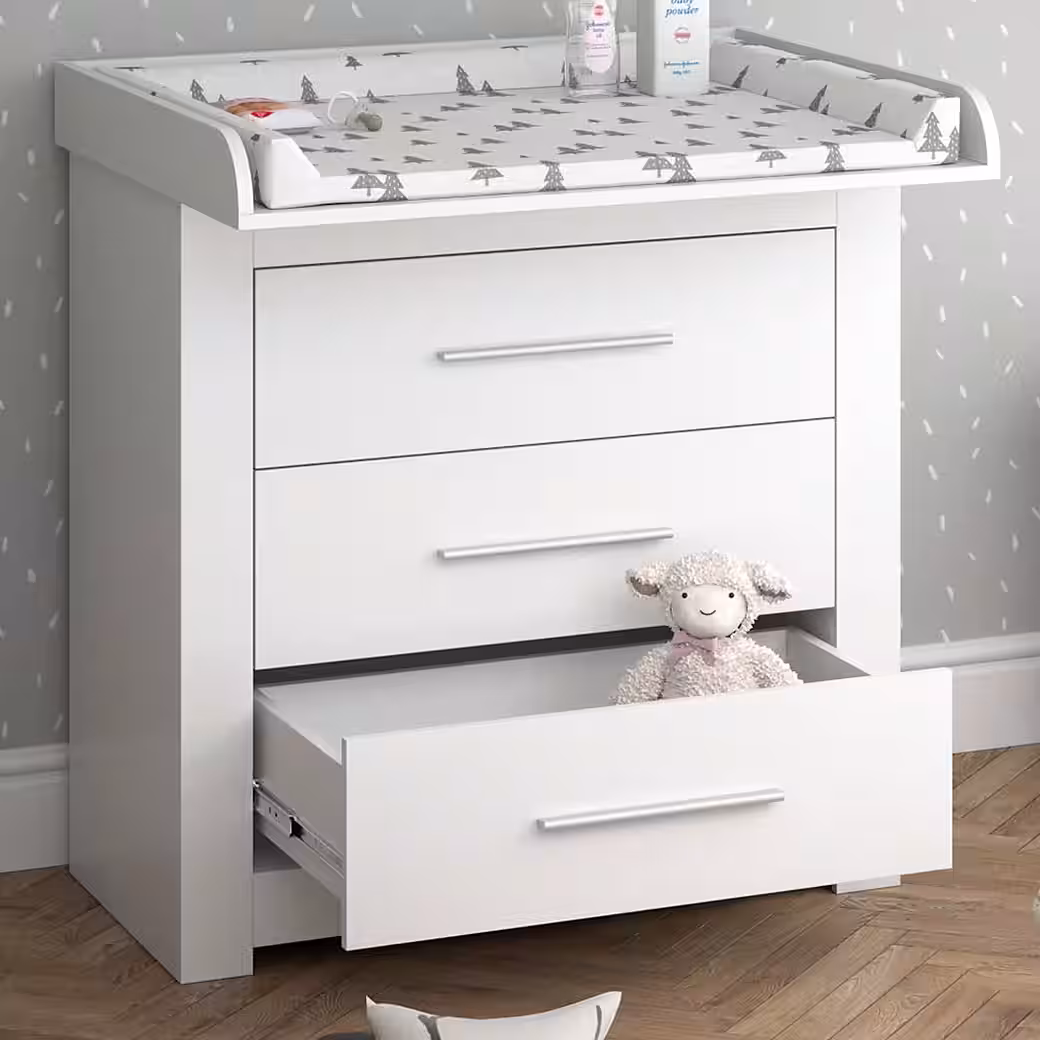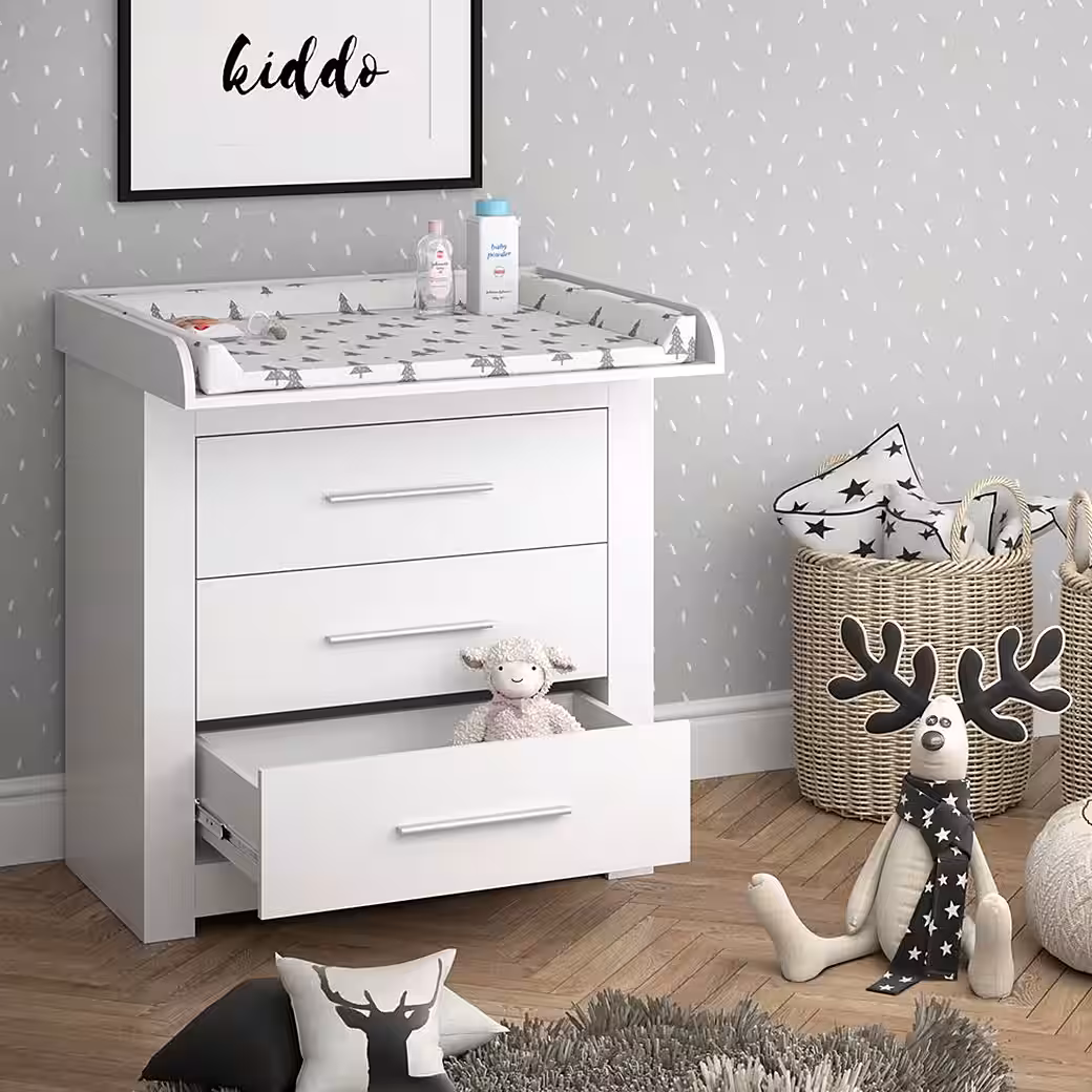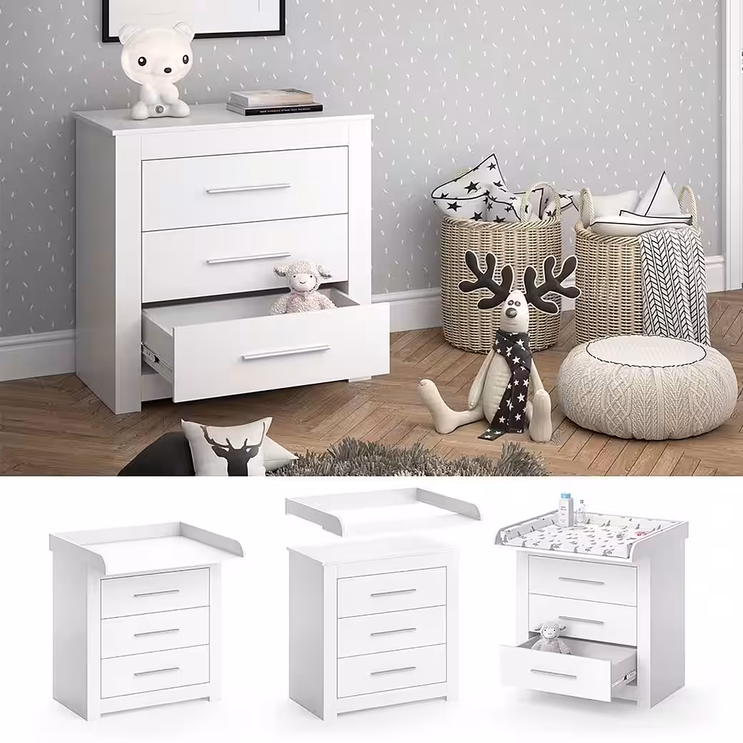 Do not leave your child unattended. Should pieces of furniture tip over, serious or life-threatening injuries can result. Therefore, anchor this piece of furniture to the wall. Use fastening fittings that are suitable for the local walls. All assembly means must always be tightened sufficiently tightly and checked regularly. Please carefully implement each step of the instructions. For bunk beds, the upper floor is not suitable for children under 6 years due to risk of falling. Avoid attaching hooks or handles to which children can get stuck on all cots. Make sure that the distance between the bed and the wall excludes a pinching. For increased safety in the area of cots, always choose a mattress to the same extent to avoid slipping. For changing tables, please ensure a suitable changing mat that corresponds to the dimensions of the changing attachment and offers sufficient protective edges. Spare parts are from the manufacturer or Suppliers to obtain. Do not use the article if there is a defect.