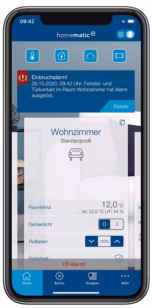 Within the Homematic IP system, this small sensor performs several functions. Firstly, it automatically reduces heat supply when ventilating by notifying the Homematic IP radiator thermostat as soon as a window or exterior door is opened. A particularly useful feature is the ability to define a notification delay for frequently used doors, preventing the radiator valves from being constantly opened and closed. Secondly, the sensor reliably monitors access to your home when you are away. With alarm mode activated, the Homematic IP siren can be triggered if a window is opened without authorization. The app also sends a warning message to the user via push notification, giving them the opportunity to react promptly to the hazardous situation.
