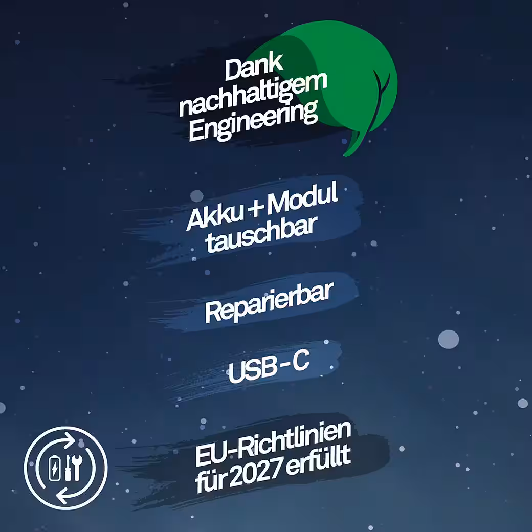 The integrated battery features a battery management system compliant with EU standard EN62133-2, offering you the best possible protection according to current technological standards. After a prolonged period of non-use, the deep discharge protection activates and prevents charging of a potentially damaged battery. Therefore, charge the light regularly and after use to ensure you can enjoy your product for a long time.