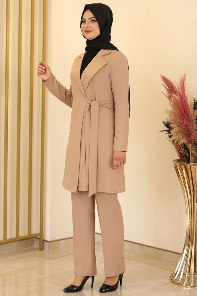 ATTENTION: Important sizing information Please follow our sizing guide carefully to ensure the perfect fit. The suit runs one size smaller, so please order according to the EU sizes in parentheses to ensure the suit is your regular size. Elegance meets comfort with our women’s two-piece pantsuit, specially designed for the discerning woman. This ensemble features a long-sleeved jacket with visual pockets that refine the design without being functional, and matching trousers that together allow a seamless transition from formal to casual occasions. The jacket has a length of 100 cm, a V-neck and a wide collar that emphasizes your feminine silhouette. A belt fastening in the same fabric as the suit adds an additional stylish touch. The trousers, also 100 cm long and with an elastic waistband at a mid-rise, offer optimal comfort and freedom of movement. Made from a very lightweight crepe fabric, this suit is ideal for warmer days in spring and summer. Available in black, cream-white, beige, and blue – choose your favorite and enjoy a high-quality garment that cuts a fine figure both in the office and on special occasions.