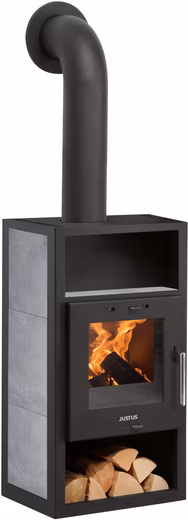 The Texas stove immediately catches the eye with its elegant design and high-quality craftsmanship, featuring a steel body and soapstone ceramic. The extra-large, fully glazed panoramic window of the combustion chamber door crowns its sophisticated design. With a continuous operating time of over 24 hours, the Texas is a true workhorse, capable of providing comfortable warmth to rooms up to 115 m³ in volume. The clever, extra-large warming compartment above the combustion chamber is ideal for keeping food or drinks at the perfect temperature. The air-cooled handle ensures safe and comfortable opening and closing of the combustion chamber door.