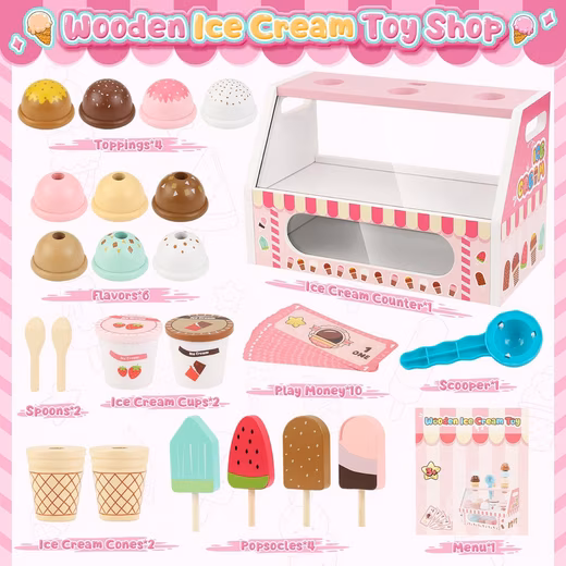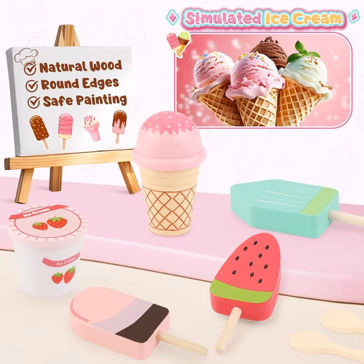 [Wooden Toy for Ages 3 and Up] Made from exquisite natural wood, this wooden ice cream toy features a smooth surface that has been carefully polished to eliminate any sharp edges, ensuring a safe and thoughtful play experience for children.