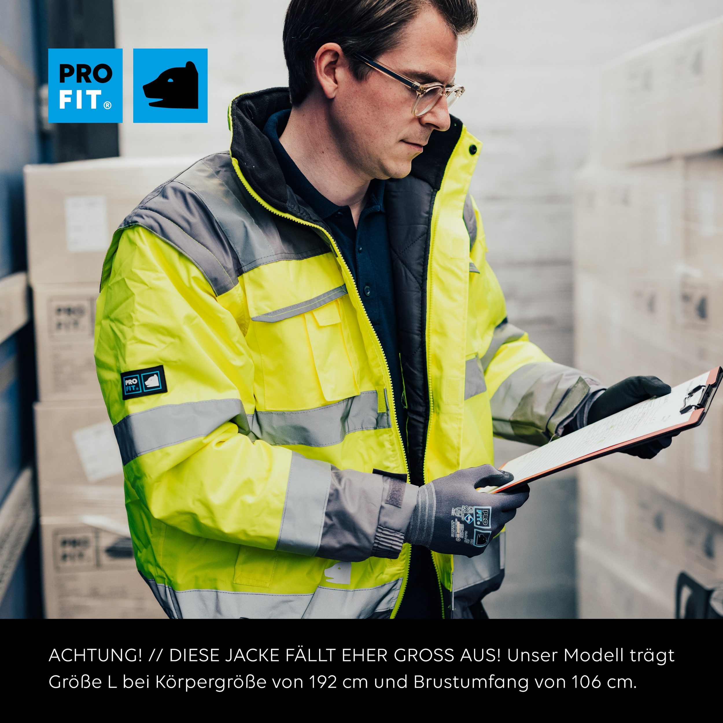 The PRO FIT high-visibility pilot jacket in striking neon yellow and gray offers maximum safety and comfort for work environments requiring high visibility. This versatile and functional work jacket is ideal for outdoor work in all weather conditions. Key features: High visibility: The jacket is equipped with reflective stripes and shoulder reflective elements, ensuring optimal visibility and safety. Wind and water resistant: The jacket’s material is wind and waterproof, with high-quality welded seams that provide protection in all weather conditions. Detachable sleeves: The jacket’s sleeves are detachable, and the cuffs are adjustable, allowing for flexibility and comfort in any work situation. Ample storage: The jacket features an integrated hood in the collar and numerous pockets, including sleeve, chest, side, and cell phone pockets, providing optimal storage space. Superior comfort: The fleece-lined collar, adjustable cuffs, and knitted hem ensure an optimal fit and superior comfort. Benefits: Safety at work: Thanks to the striking color scheme and reflective stripes, you are highly visible even in low-light conditions. Protection from wind and water: The jacket’s waterproof and windproof design makes it ideal for outdoor work in any weather. Flexibility and adaptability: The removable sleeves and adjustable cuffs offer flexibility and comfort for various work situations. Practical features: The numerous pockets ensure that your tools and personal items are always within easy reach. Comfort and fit: The fleece-lined collar and knitted hem provide a comfortable feel and a perfect fit. The PRO FIT high-visibility pilot jacket combines high visibility and safety with optimal comfort and versatile features. With its wind- and water-repellent material, removable sleeves, and numerous pockets, it is the ideal choice for anyone working in demanding conditions. Rely on the quality and functionality of the PRO FIT high-visibility pilot jacket and feel perfectly equipped in any work situation.