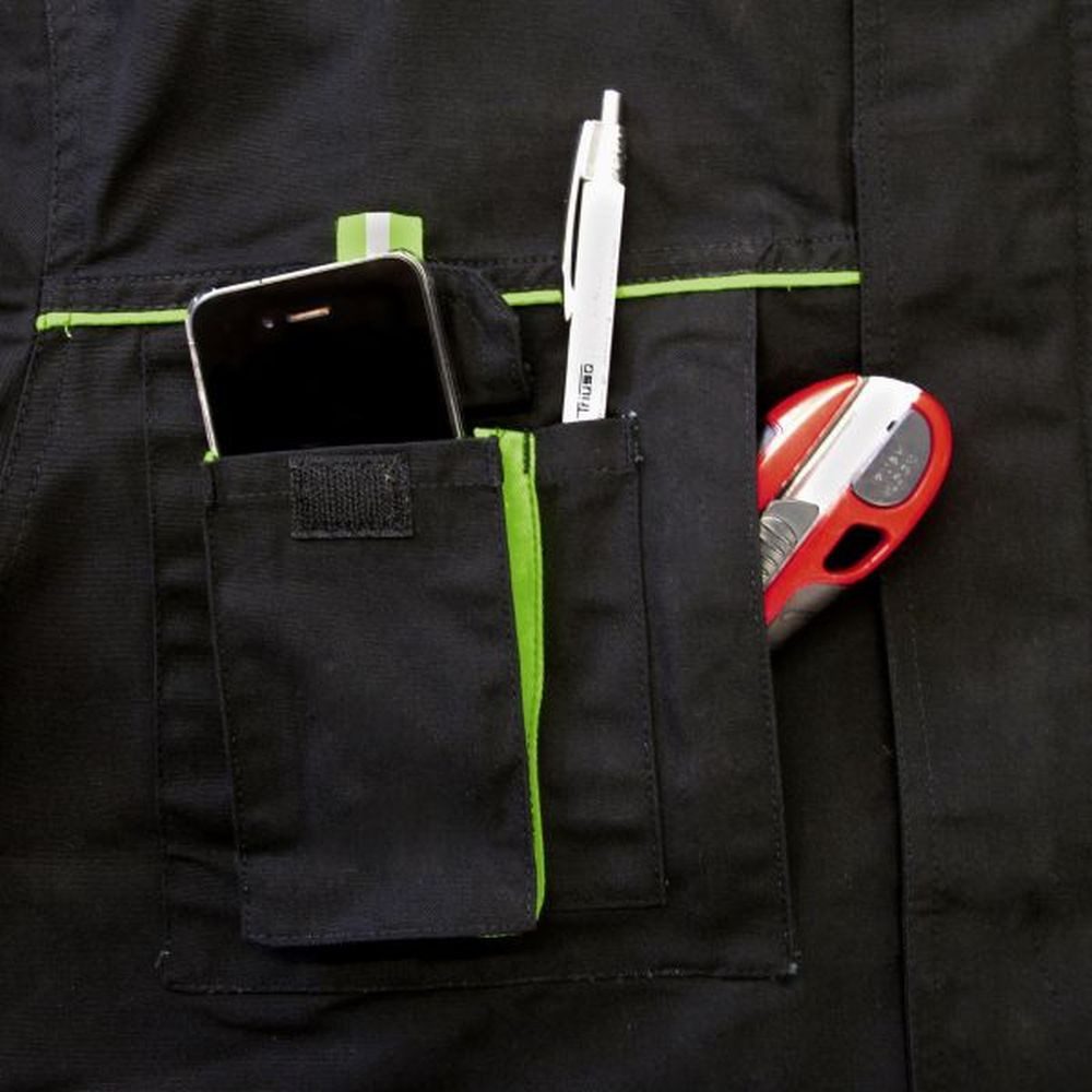- Pockets: 2 zippered chest pockets, one with a mobile phone pocket; 2 reinforced patch pockets