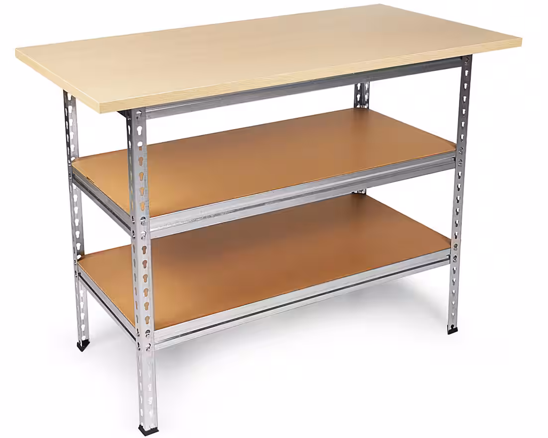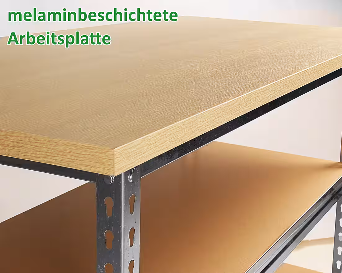 Looking for a good and affordable workbench? If practicality and excellent value for money are your top priorities, then this workbench is exactly what you need. It couldn’t be easier for DIY enthusiasts. This workbench provides the ideal surface for crafting, packaging, and repairs. The sturdy 120 cm long wooden worktop is coated with melamine and is 25 mm thick – making it exceptionally robust! Beneath the worktop are two large shelves (each with a total load capacity of 70 kg) where bulky tools or equipment like watering cans and drills can be stored. The two intermediate shelves not only add stability but also offer plenty of storage space that can be used effectively and are height-adjustable. This allows you to easily set aside tools that are not currently in use, ensuring you can work without distractions. You can fully utilize the workspace. The workbench measures approximately 120 x 60 x 92 (H) cm. To ensure exceptional stability and durability, the packing table is made of galvanized metal. This also protects the workbench from corrosion and moisture. Thanks to the included assembly instructions, you can assemble the workbench in approximately 20 minutes. All necessary accessories are, of course, included in the package. If you are convinced by this workbench, then order it online from us today. We also offer matching tool cabinets and pegboards in our online shop. All dimensions are approximate and refer to the maximum external dimensions of the item. The shipping weight is also approximate. Should you require more precise information, please contact our support team.