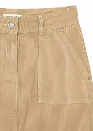 Authentic & cool: This short mini skirt made of pure cotton is available in denim or corduroy, depending on the color. In a short length and with a slight A-shape, it features a classic waistband with a metal logo button and zipper for closure and an internal elastic band for adjusting the width. Signature features include the striking seams and stud details on the pockets. It also features large patch pockets on the front.