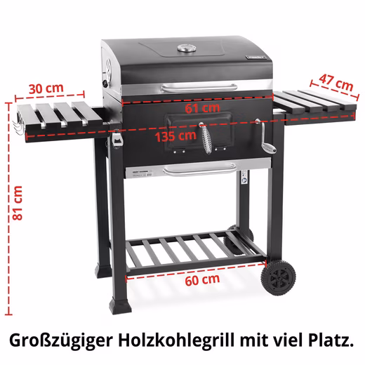- INFINITELY ADJUSTABLE CHARCOAL PAN – Height adjustment 70–210 mm via crank for pinpoint temperature control – precise grilling at any ember level.